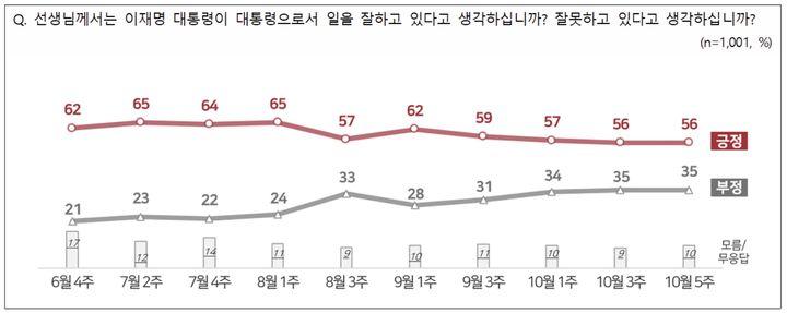 직전 조사(10월3주차)와 비교해 긍정 평가와 부정 평가는 동일했다.
