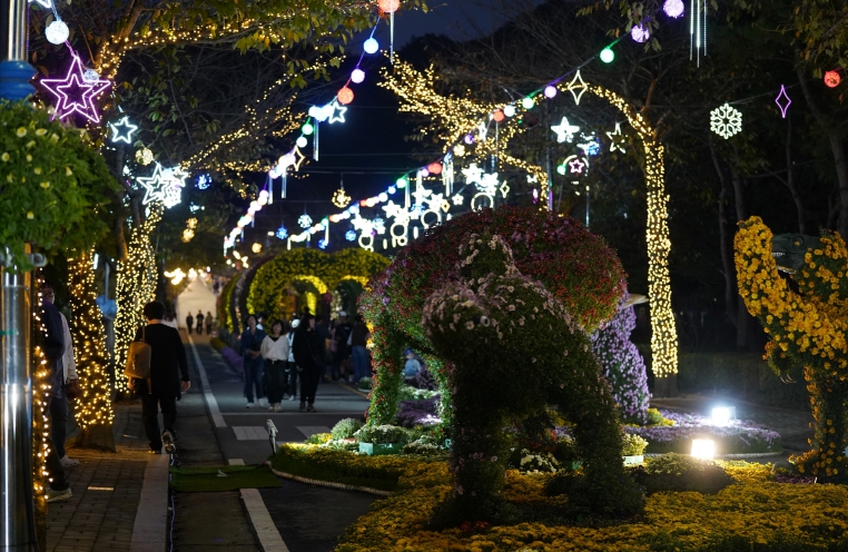 공룡, 꽃 터널, 캐릭터 등 각양각색의 조형물을 활용한 4개의 테마존, 분재국화 전시장 등이 3만여점 다양한 국화로 물들고, 야간에는 LED 경관 조명으로 더욱 아름다워진다.