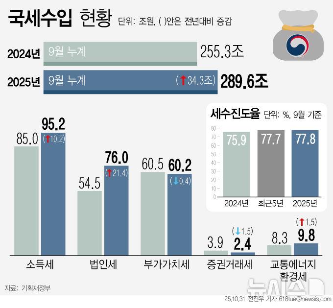 기획재정부가 31일 발표한 '2025년 9월 국세수입 현황'에 따르면 올해 1~9월 누계 국세수입은 289조6000억원으로, 전년 같은 기간보다 34조3000억원 증가했다.