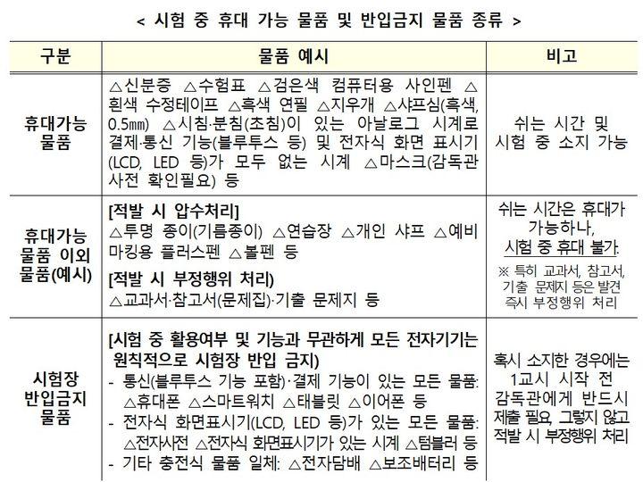 보청기, 돋보기, 연속혈당측정기 등 개인의 신체조건 또는 의료상 특별한 이유로 휴대가 필요한 물품은 매 교시 감독관의 사전 점검을 거친 후 휴대할 수 있다.