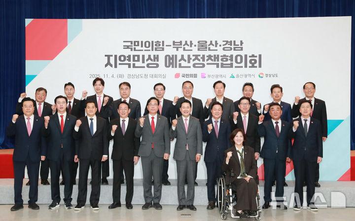 장동혁 대표를 비롯한 국민의힘 지도부는 이날 경남 창원 경남도청에서 부산·울산·경남 예산정책협의회를 개최하고 내년도 지역 예산안과 관련한 현안 등을 청취했다.