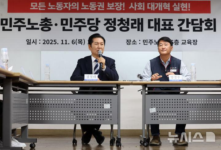 정 대표는 이날 오전 서울 중구 전국민주노동조합총연맹에서 열린 '민주노총-민주당 정책간담회'에서 이같이 말하며 "생존권을 지키기 위해 거리로 뛰쳐나온 노동자들을 강성 노조니, 귀족 노조니 매도하기도 했다"고 했다.
