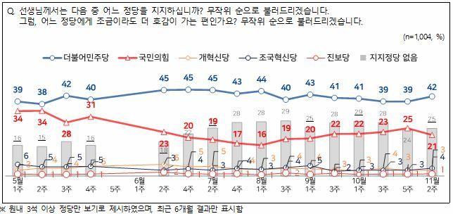 엠브레인퍼블릭·케이스탯리서치·코리아리서치·한국리서치가 지난 10~12일 만 18세 이상 남녀 1004명을 대상으로 진행한 NBS(전국지표조사)에서 정당 지지도는 민주당이 42%, 국민의힘이 21%로 집계됐다.