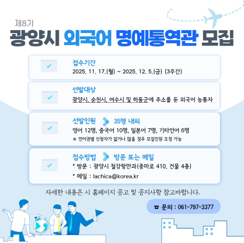 제8기 모집 인원은 총 35명(영어 12명, 중국어 10명, 일본어 7명, 기타 언어 6명) 내외이며, 지원 자격은 광양시를 비롯해 순천·여수·하동 등 인근 지역 거주자 중 외국어 능통자 또는 한국어가 능숙한 외국인이다. 선발된 명예통역관은 2026년 1월부터 2027년 12월까지 2년간 활동한다.
