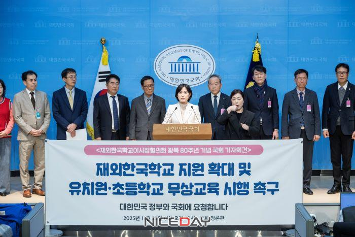 이에 재외한국학교이사장협의회(이상철 회장·중국 소주한국학교 이사장)는 기자회견에서 “재외한국학교와 재외동포 교육지원은 대한민국 역대 정부와 대통령께서 해외 순방 때마다 700만 재외동포사회에 약속해 온 국가적 책무”라며 “유치원과 초등학교부터 단계적으로 무상교육·무상급식을 도입하고, 노후화된 교육환경을 획기적으로 개선하는 등 재외한국학교와 재외동포교육이 내실있게 운영될 수 있도록 정부와 국회가 적극적으로 나서달라”고 촉구했다.