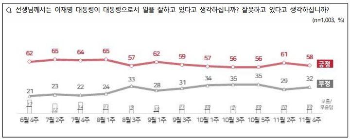 엠브레인퍼블릭·케이스탯리서치·코리아리서치·한국리서치가 지난 24일부터 26일까지 만 18세 이상 남녀 1003명을 대상으로 진행한 11월 4주차 전국지표조사(NBS)에서 이 같은 결과가 나왔다. '모름·무응답'은 10%였다.