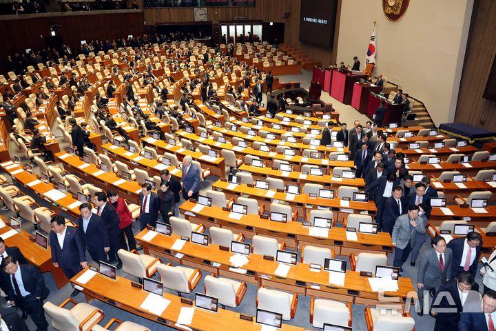 국민의힘은 표결이 시작되자 퇴장했고, 본회의장 앞 로텐더홀에서 규탄대회를 열었다.