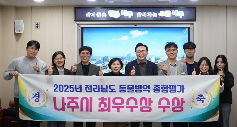 28일 나주시에 따르면 전라남도 주관 ‘2025년도 동물방역위생 시책 추진종합평가’에서 최우수상을 받았으며 대상을 받았던 지난해에 이어 올해도 주요 가축전염병 발생 ‘0건’을 기록하며 안정적인 방역체계를 이어가고 있다.