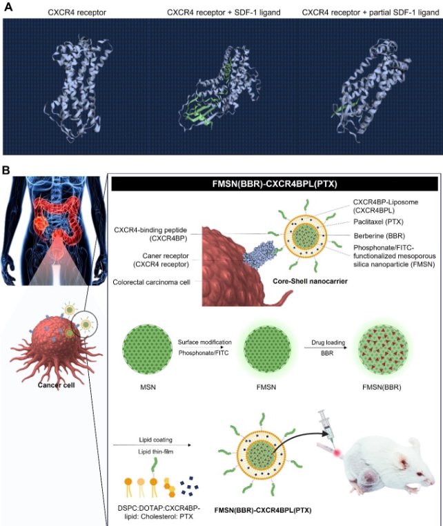 이 나노캐리어는 메조포러스 실리카 코어와 리포좀 껍질로 구성되어 베르베린(BBR)과 파클리탁셀(PTX)을 동시에 효과적으로 실어 나를 수 있다.