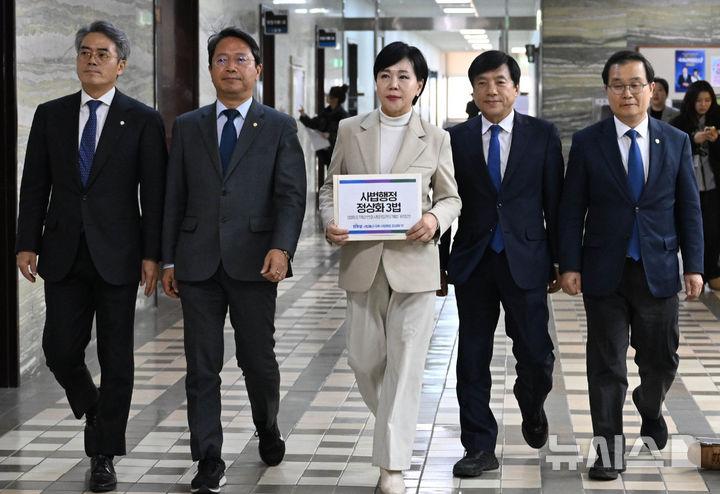 전현희 TF 단장은 3일 국회 본천 의안과를 찾아 법원조직법·변호사법·법관징계법 개정안 등 3개 법안을 정식 제출했다. 대법원장의 법관 인사권을 다루는 법원행정처 폐지 등이 주요 내용이다.