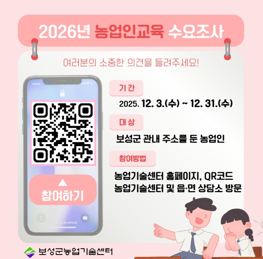 보성군농업기술센터 김숙희 소장은“농업인 여러분의 소중한 의견이 실효성 있는 교육과정 설계에 기초가 된다.”며, “현장에서 실제로 필요로 하는 교육을 제공할 수 있도록 많은 참여를 부탁드린다.”라고 전했다.