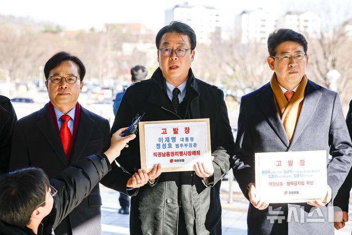 국민의힘은 이재명 대통령과 정성호 법무부 장관을 8일 직권남용권리행사방해 혐의로 고위공직자범죄수사처에 고발했다.
