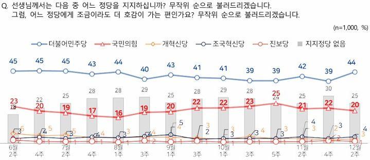 직전 조사(11월4주차) 대비 민주당 지지도는 5%포인트 올랐고, 국민의힘은 2%포인트 떨어졌다.