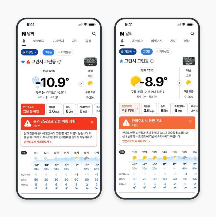안전리포트 카드는 현재 또는 가까운 미래에 위험 요소가 탐지된 경우에만 노출된다. 카드는 네이버 날씨 홈의 동별 페이지에 제공되며, 현재 날씨 하단 카드를 클릭하면 상세 내용을 담은 대형 카드로 확대된다. 대형 카드 내 '자세히 보기'를 선택하면 리포트 전체를 확인할 수 있는 타임라인 영역으로 이동할 수 있다.