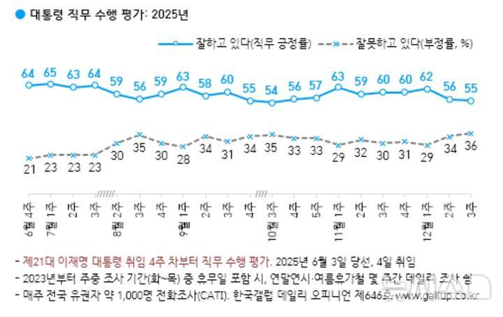 한국갤럽이 지난 16~18일 전국 만 18세 이상 1001명을 대상으로 이 대통령이 현재 대통령으로서의 직무를 잘 수행하고 있다고 보는지 물은 결과 '잘하고 있다'는 긍정 평가는 55%로 직전 조사 대비 1%포인트 하락했다. '잘못하고 있다'는 부정 평가는 36%로 지난주보다 2%포인트 상승했다. 9%는 의견을 유보했다.