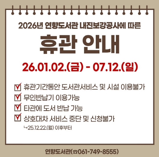 휴관 기간은 공사 일정에 따라 단축 또는 연장될 수 있으며 일정 변경 시 순천시립도서관 홈페이지를 통해 공지할 예정이다.