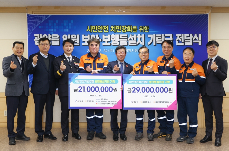 이날 포스코광양제철소, 광양경찰발전협의회, 광양제철소파트너사협회 3개 기업·단체가 주민 생활안전 개선에 뜻을 모아 총 5,000만 원의 기탁금을 전달했다. 기탁금은 관내 취약지역에 블랙박스 보안등 11등과 고효율 LED 보행등 30등을 설치하는 데 사용될 예정이다.