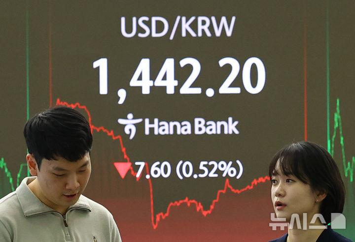 27일 외환 당국에 따르면 전날 서울외환시장에서 원·달러 환율은 전 거래일보다 9.5원 내린 1440.3원에 주간 거래를 마쳤다. 지난 24일 장중 1484.9원까지 올랐던 원·달러 환율은 외환당국의 구두개입과 정책 대응 등으로 인해 2거래일 간 45원 가까이 떨어졌다.