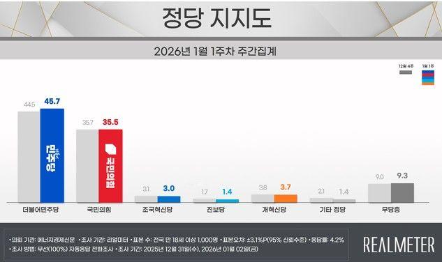 여론조사 전문회사 리얼미터가 에너지경제신문 의뢰로 지난달 31일과 지난 2일 이틀간(1월 1주차) 전국 18세 이상 유권자 1000명을 대상으로 한 정당 지지도 조사에 따르면 민주당은 45.7%, 국민의힘은 35.5%로 집계됐다.