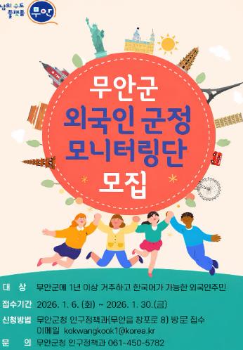 모집 대상은 무안군에 거주하는 외국인주민으로, 공개 모집을 통해 선발하며 국적과 배경이 다양한 구성원으로 운영될 예정이며, 선발된 단원들은 정기 간담회와 현장 모니터링 활동을 통해 외국인주민의 생활 속 불편 사항과 정책 개선 의견을 제안하는 등 군정 참여 역할을 수행하게 된다.