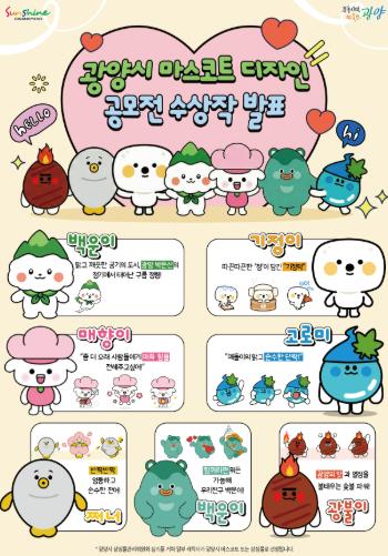 최우수상에는 매화꽃 모자를 쓴 양 캐릭터 ‘매향이’가 선정됐으며, 우수상은 백운산 모자를 쓴 구름 정령 ‘백운이’와 광양의 먹거리인 기정떡을 형상화한 ‘기정이’가 각각 수상했다.
