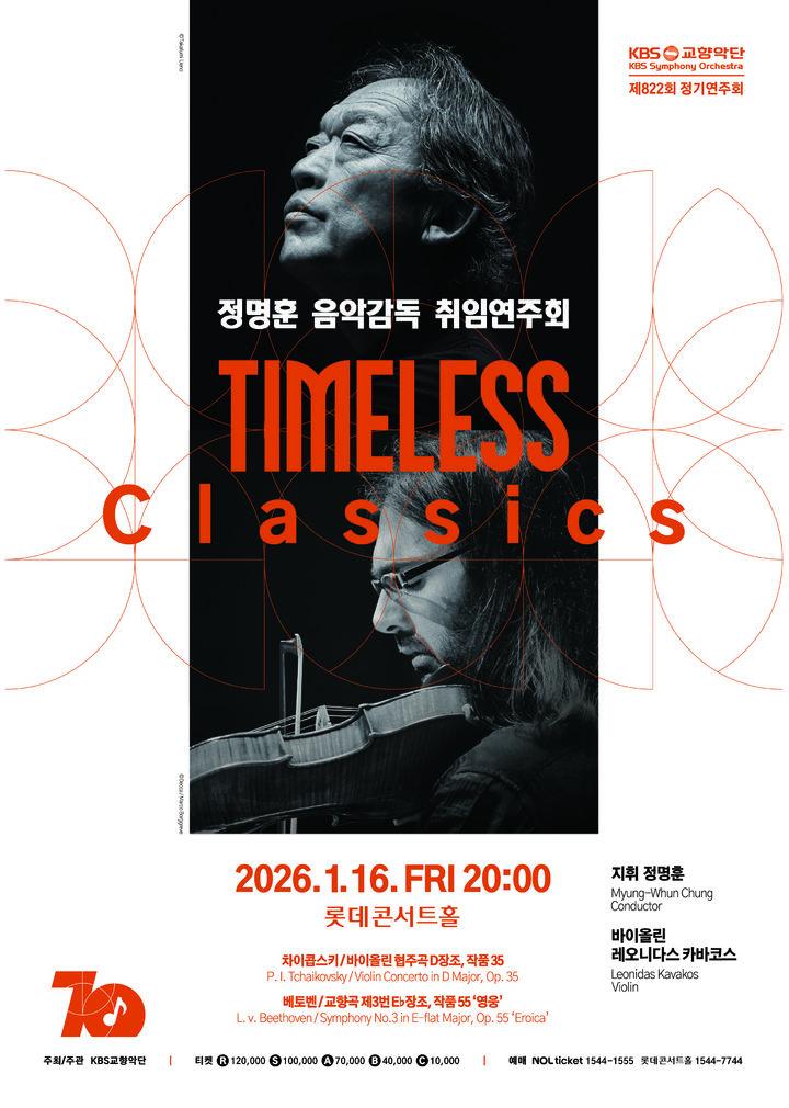 KBS교향악단은 오는 16일 서울 송파구 롯데콘서트홀에서 정명훈 음악감독 취임연주회이자 'KBS교향악단 제822회 정기연주회'가 개최된다고 6일 밝혔다. 정명훈은 음악감독 취임 이후 첫 연주회로, 차이콥스키의 '바이올린 협주곡'과 베토벤의 교향곡 제3번 '영웅'을 지휘한다.