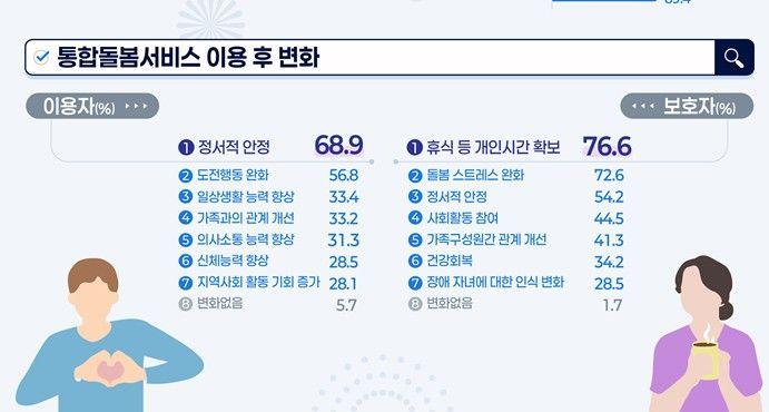 조사 결과 우선 보호자의 76.6%는 서비스 이용을 통해 휴식 등 개인시간을 확보할 수 있었다고 응답했다. 이어 72.6%는 돌봄 스트레스가 완화됐으며, 54.2%는 정서적으로 안정됐다고 평가했다.