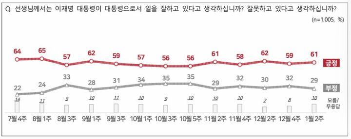 2주 전 조사(12월 넷째 주)에 비해 이 대통령 국정수행 긍정 응답률은 2%포인트 상승(59%→61%), 부정 응답률은 3%포인트 하락(32%→29%)했다.