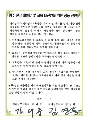 전남교육청은 4개 항으로 된 선언문에서 지역 소멸 위기 극복을 위한 광주·전남 대통합에 적극 찬성하며, 통합 특별시의 성공적인 안착을 위해 전남도와 긴밀히 협력하기로 했다.
