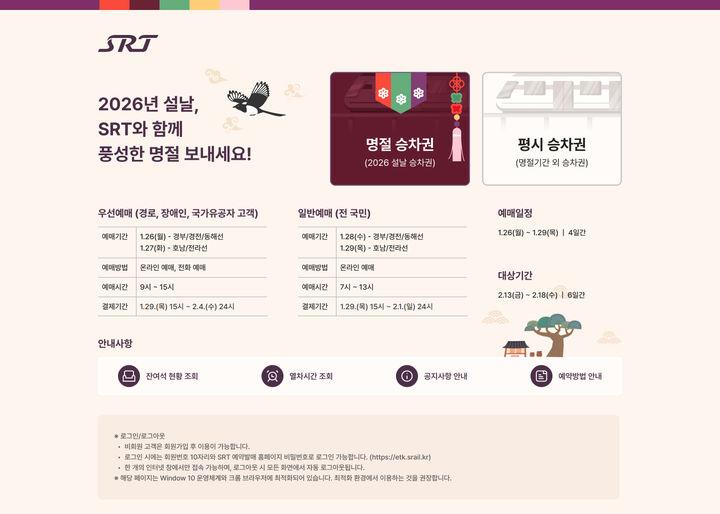 올해 설 명절 예매 대상은 2월13일부터 18일까지 총 엿새간 운행하는 열차로, 교통약자 우선예매와 전 국민 대상 예매로 구분해 순차적으로 예매기간을 운영한다.