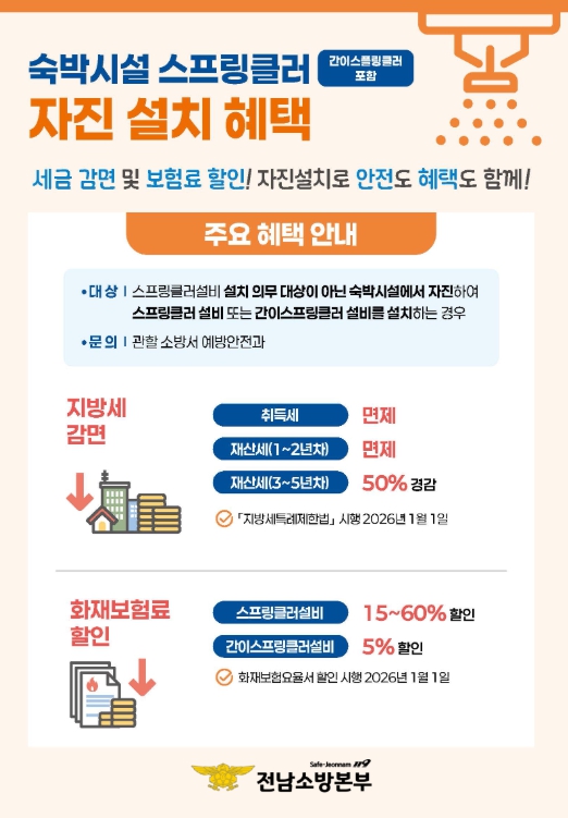 주영국 전남소방본부장은 “숙박업주의 부담을 줄이면서 도민과 관광객의 안전을 확보할 수 있는 좋은 기회”라며 “화재 예방을 위해 관계자분들의 적극적인 참여를 바란다”고 전했다.