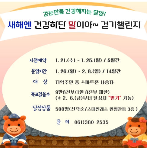군 관계자는 “걷기와 같은 일상적인 신체 활동이 건강을 지키는 기본인 만큼, ‘워크온’을 활용해 누구나 쉽게 참여할 수 있는 걷기 챌린지를 지속적으로 운영하겠다”고 말했다. 이어 “매월 ‘걷기의 날’을 지정하고 마을별 ‘걷기 좋은 길’을 발굴해 일상 속 걷기가 군민 건강으로 이어질 수 있도록 힘쓰겠다”고 전했다.