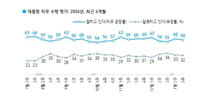 전주 조사(1월2주차) 대비 긍정 평가와 부정 평가는 각각 2%포인트(p), 1%포인트 내렸다.