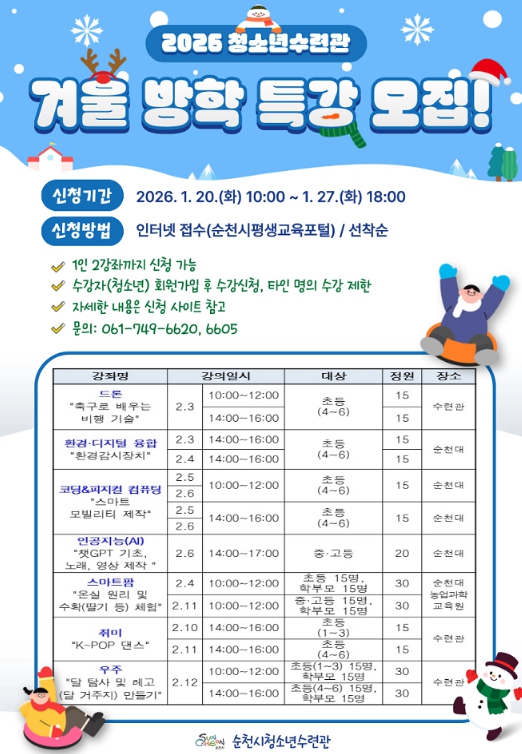 순천시 청소년수련관 및 순천대학교 일원을 중심으로 2월 3일부터 2월 12일까지 운영되며, 관내 초·중·고등학생과 학부모 총 260명을 대상으로 오는 20일 오전 10시부터 27일 오후 6시까지 순천시평생교육포털을 통해 온라인 선착순으로 모집한다.