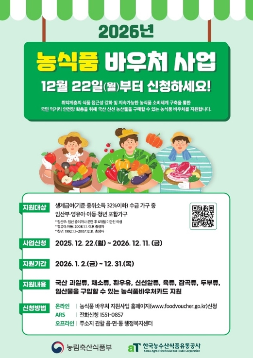 신청은 오는 12월 11일까지 수시로 접수하며, 읍·면·동 행정복지센터 방문 또는 농식품 바우처 누리집 통한 온라인 신청, 대표번호 ARS 서비스를 통해 신청 가능하다.
