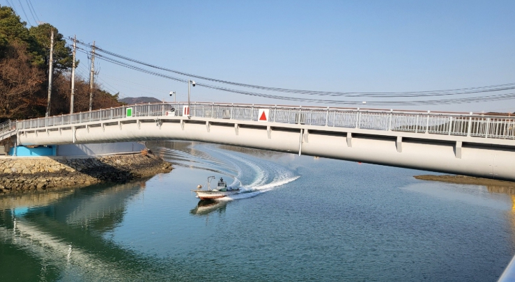 태인보도교는 태인동 도촌마을과 금호동 금섬해안길을 잇는 보행 전용 교량으로, 총연장 63.5m, 폭 5.0m, 높이 4.45m 규모로 조성됐다.