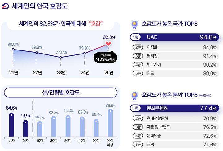 조사 결과 외국인의 한국에 대한 호감도는 전년(79.0%) 대비 3.3%p 상승한 82.3%로, 2018년 조사를 시작한 이래 최고 수준을 기록했다. 호감도가 80%를 넘은 것은 2021년(80.5%) 이후 두 번째이자 4년 만이다.