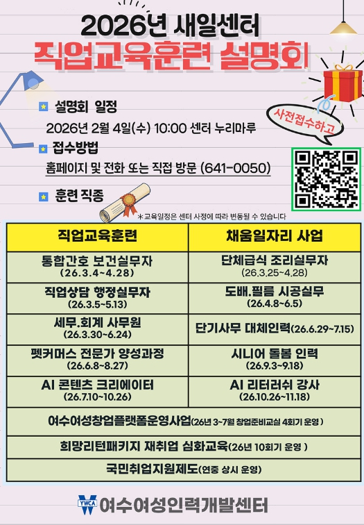 또한, 여수시가 지원하는 단기일자리 과정으로 ▲시니어 돌봄 인력 ▲AI 리터러쉬 강사 양성과정 ▲단기사무 대체인력 ▲단체급식 조리 실무자 과정 ▲전문 일자리 도배·필름 시공 실무과정도 운영 예정이다.