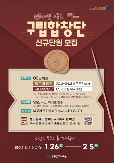 문인 북구청장은 “구립합창단은 지역의 문화예술 발전과 주민들의 정서 함양에 앞장서고 있는 단체”라며 “재능과 끼가 넘치는 주민들의 적극적인 참여를 바란다”고 말했다.