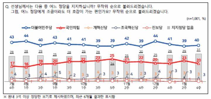 이어 개혁신당과 조국혁신당이 각각 3%를, 진보당이 1%를 기록했다. 지지하는 정당이 없거나 '모름·무응답'인 무당층은 31%를 기록했다.