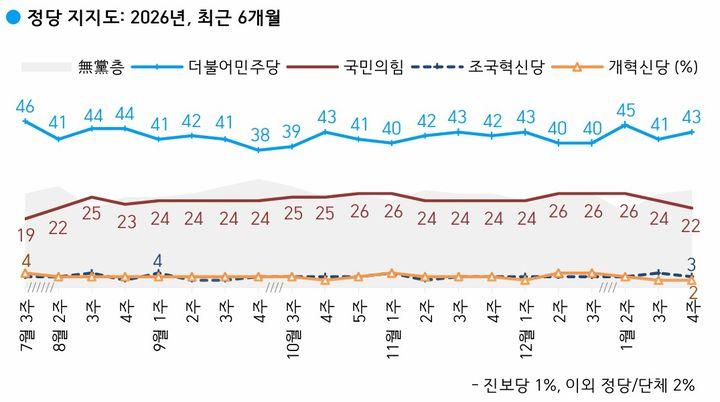 여론조사 전문회사 한국갤럽은 지난 20~22일(1월 넷째 주) 전국 만 18세 이상 유권자 1000명을 대상으로 정당 지지도를 조사한 결과 이같이 집계됐다고 밝혔다.