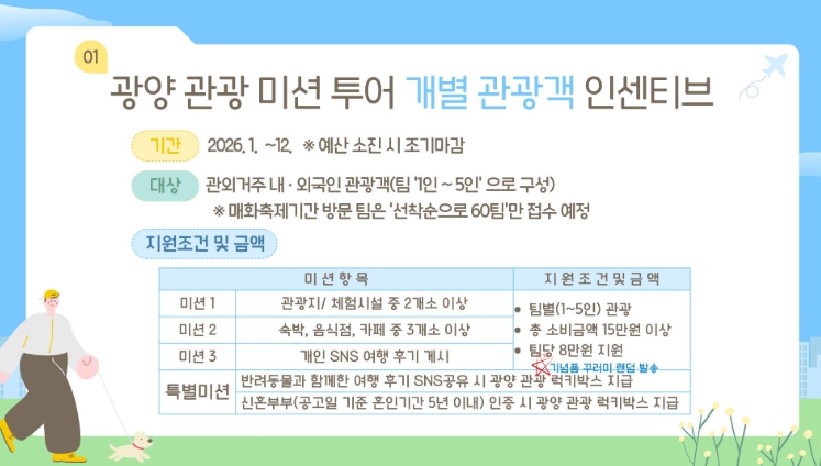 해당 사업은 1월 26일부터 운영되며, 예산 소진 시 조기 마감될 수 있고 연 1회만 지원돼 중복 참여는 불가하다. 특히 광양매화축제 기간에 방문하는 팀은 선착순 60팀으로 제한해 접수할 예정이다.