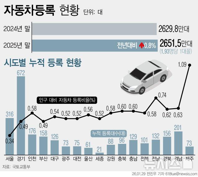 전체 자동차 누적 등록대수는 지난해 말 기준 2651만5000대로 전년 대비 0.8%(21만7000대) 증가했다. 인구 1.93명당 자동차 1대를 보유한 셈이다.