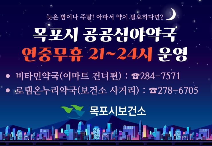 현재 목포시는 공공심야약국 2개소를 지정·운영하고 있다. 이마트 인근의 ‘비타민약국’(옥암동)은 2021년부터, 보건소 사거리 인근의 ‘로뎀온누리약국’(산정동)은 2023년부터 공공심야약국으로 지정돼 심야시간대 의약품 제공과 전문적인 복약지도를 실시하고 있다.