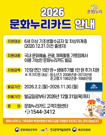 2026년 문화누리카드 지원금은 지난해 대비 1만 원 인상된 1인당 15만 원이며, 청소년기(2008~2013년생)와 준고령기(1962~1966년생) 대상자에게는 1만 원이 추가 지원된다.