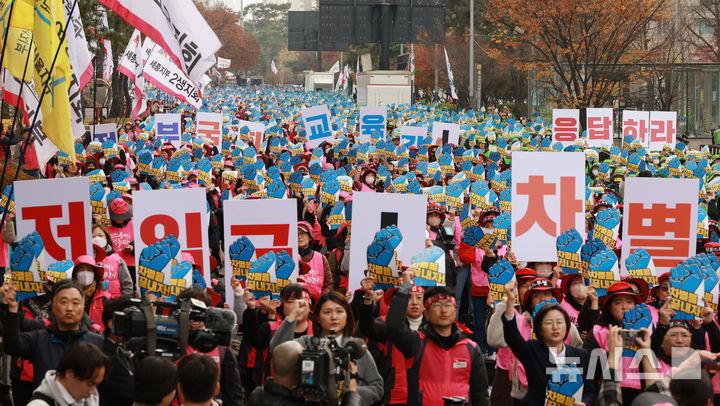 이어 "교육현장을 멈춰 세우는 책임은 노동자에게 있지 않고 교육 재정, 예산 문제라는 허울뿐인 말 뒤에 숨어 차별을 고착화해 온 교육 당국에 있다"며 "차별을 끝내고, 공정한 기준을 세우고, 학교 현장을 지탱하는 노동의 가치를 바로 세우기 위해 연대회의는 결코 물러서지 않을 것"이라고 강조했다.