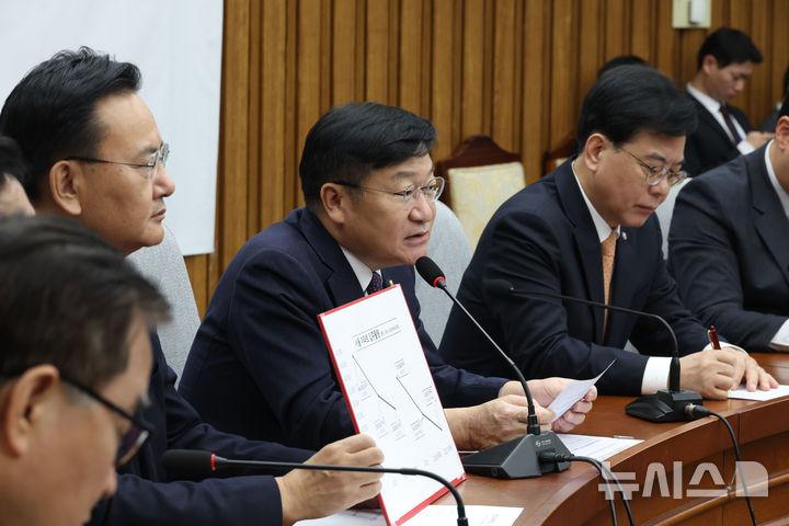 송언석 원내대표는 이날 오전 국회에서 열린 원내대책회의에서 "이재명 대통령은 더 이상 SNS(소셜네트워크서비스)를 통한 겁박으로 불안과 리스크를 키우지 말고, 시장 원칙에 기반한 민간 공급 확대 방안을 책임 있게 제시하라"고 말했다.