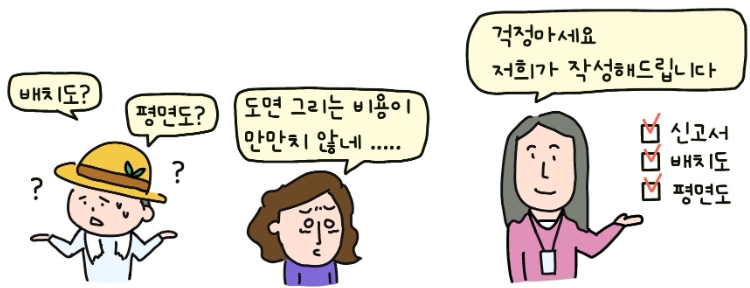 무료 작성되는 설계도서는 가설건축물 축조신고서, 배치도, 평면도로 구성되며 신청 대상은 20㎡ 이하 규모의 농막을 가설건축물로 축조 신고하고자 하는 시민이다. 단, 체류형 쉼터는 적용 대상에서 제외된다.