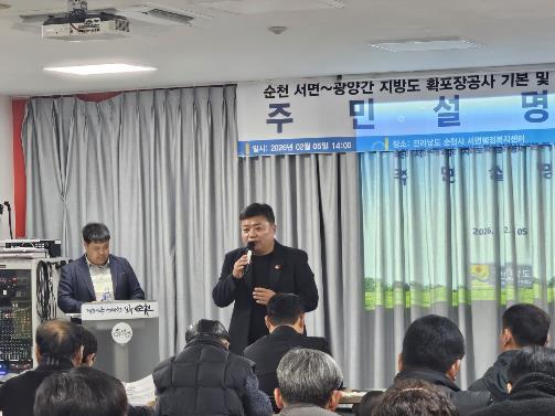 정영균 의원은 5일, 순천시 서면행정복지센터 회의실에서 열린 ‘지방도 840호선(서면~광양 간) 확포장공사 기본 및 실시설계용역 주민설명회’에 참석해 사업 현황을 점검하고 지역민의 의견을 청취했다.
