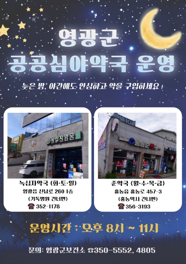 공공심야약국은 심야 시간대에도 약사가 상주하여 의약품 조제 및 복약지도를 제공하는 약국으로, 병·의원 이용이 어려운 야간이나 휴일에 군민의 의료 공백을 최소화할 예정이다.